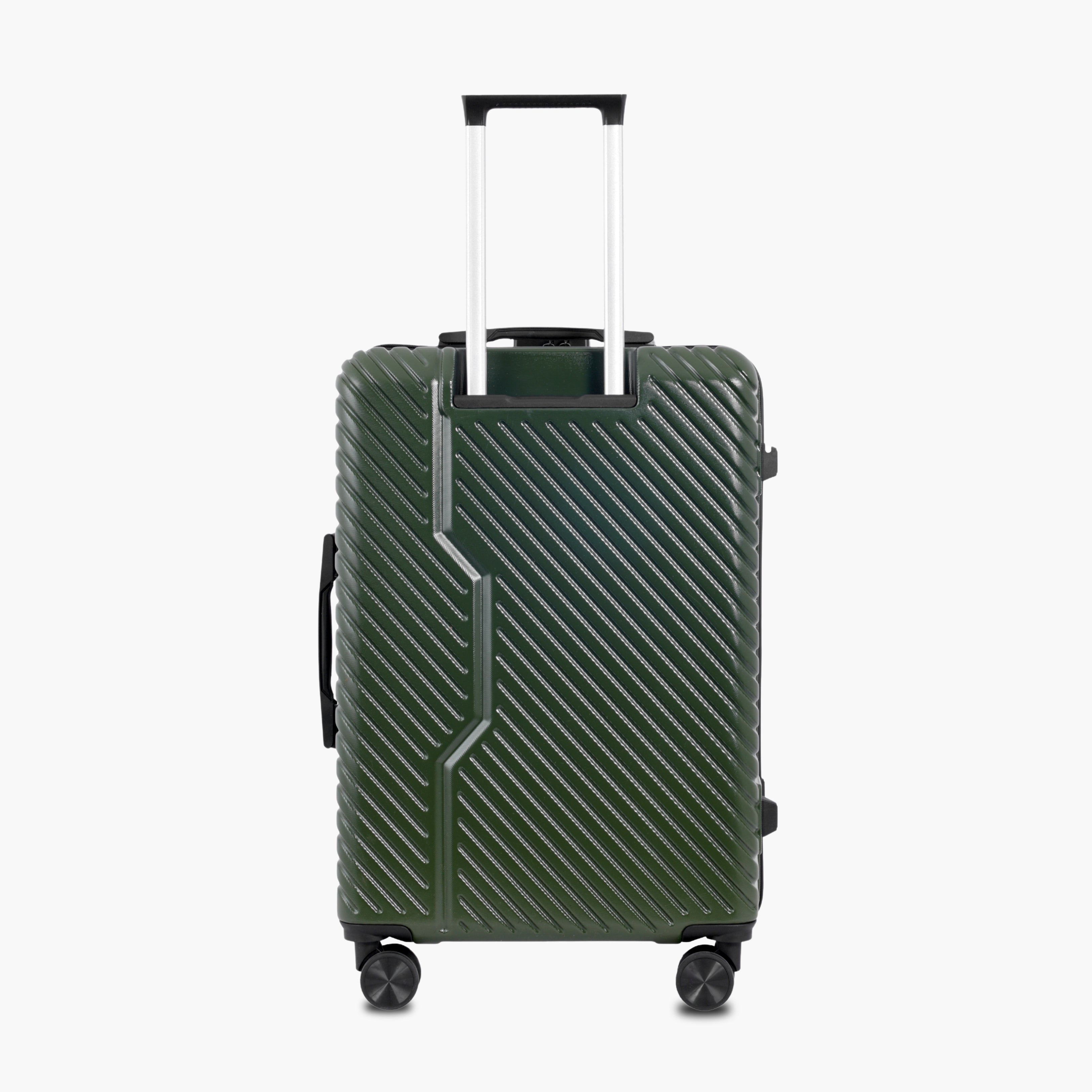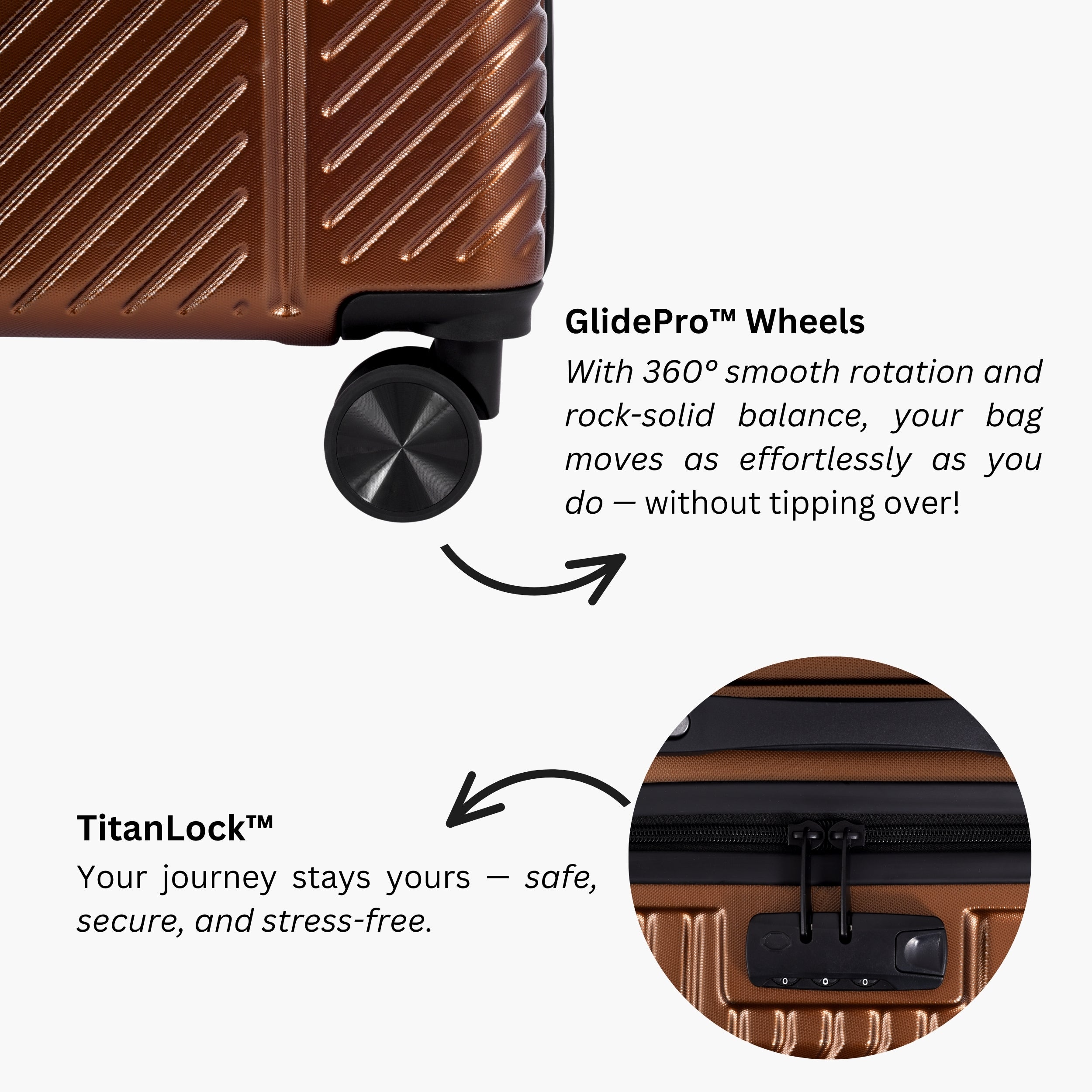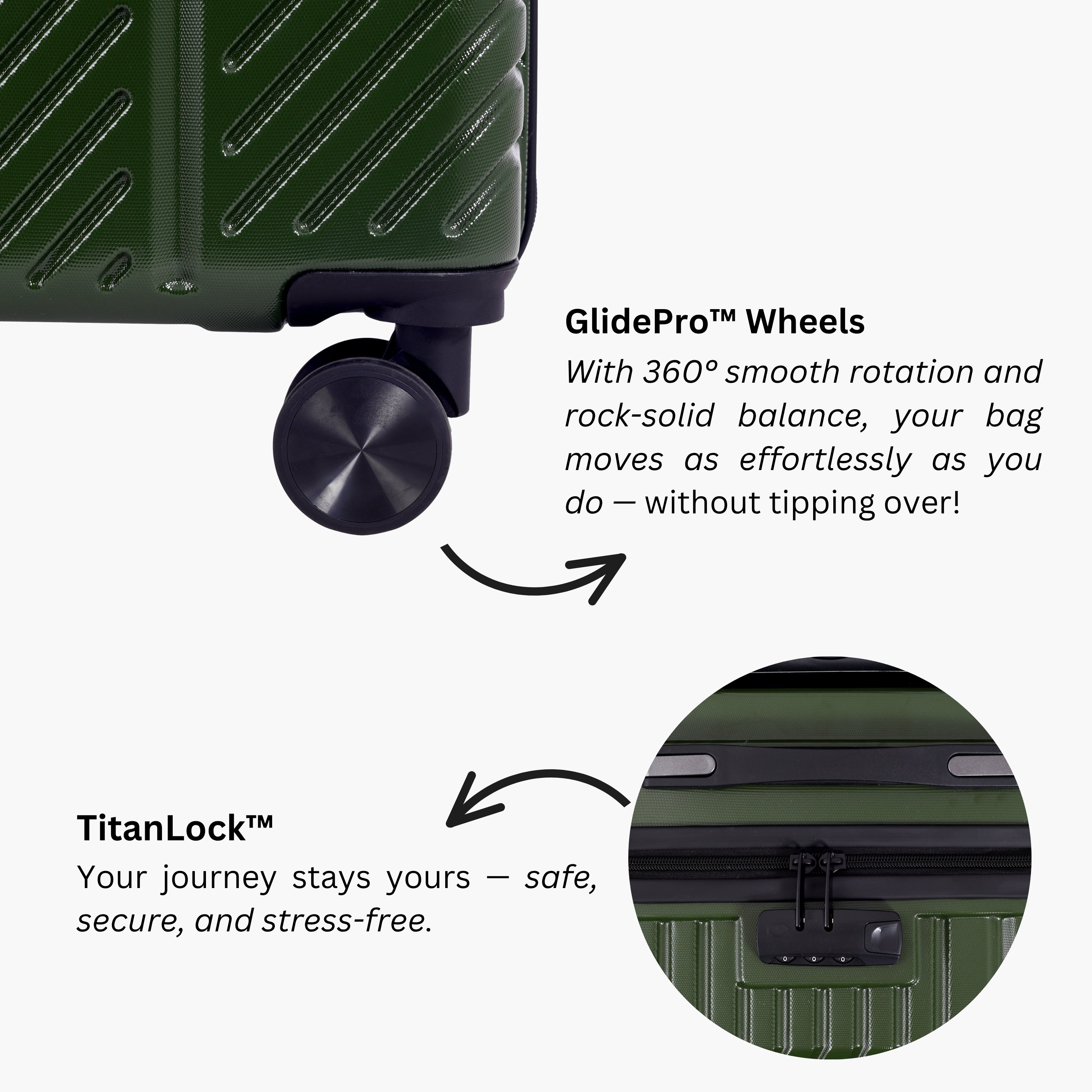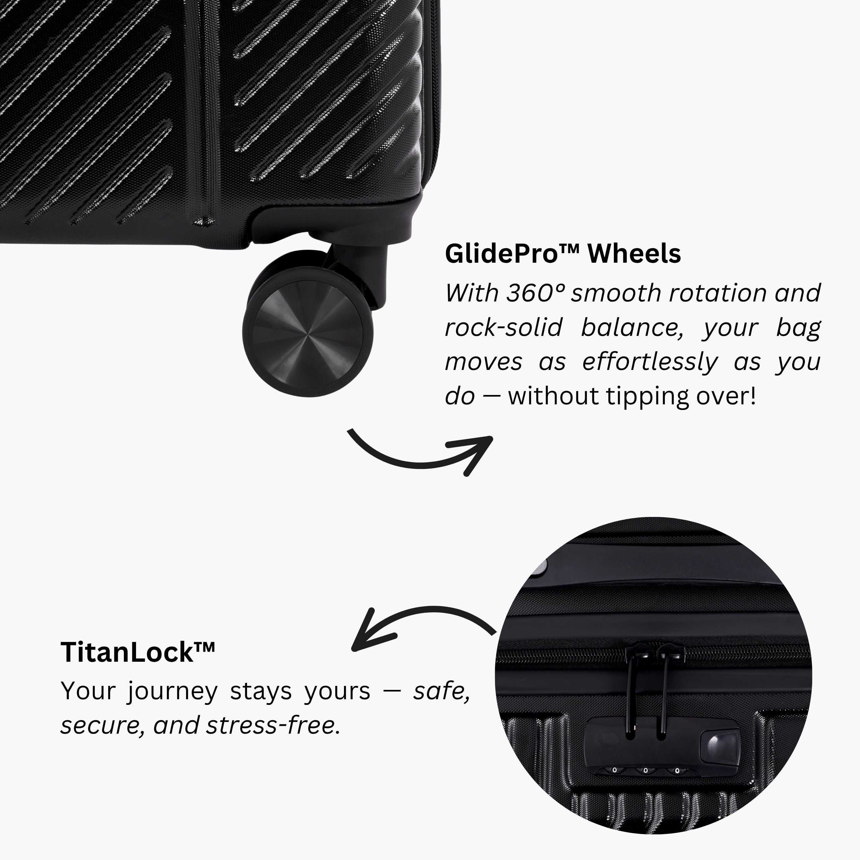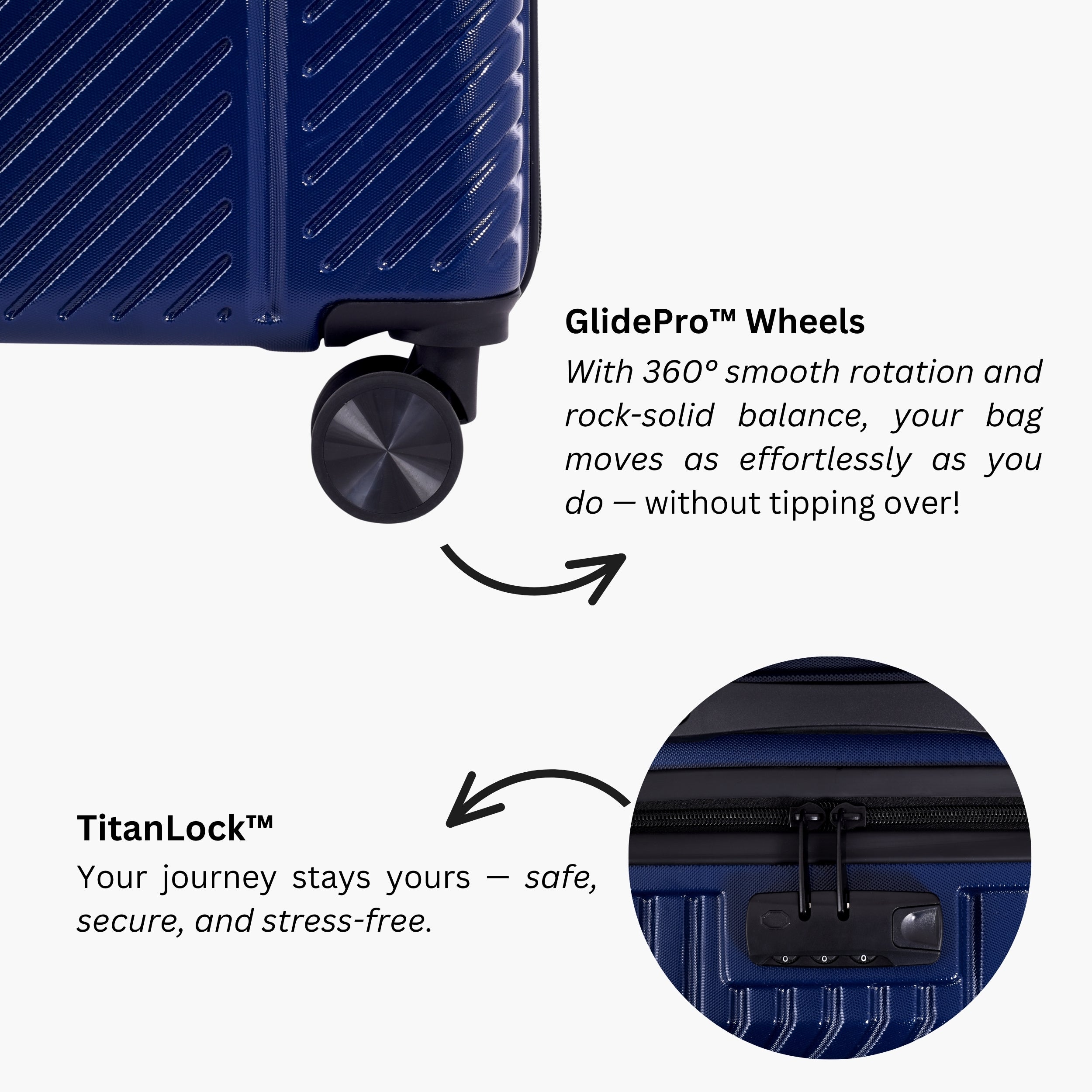 Built-in GlidePro™ 360° spinner wheels with balanced low-center gravity design. Ergonomic grip handle with soft-touch finish for a smooth journey.